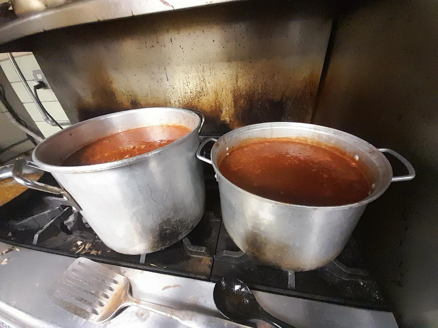 Two pots of chili simmering on a stovetop in the kitchen, with a spatula and ladle nearby.