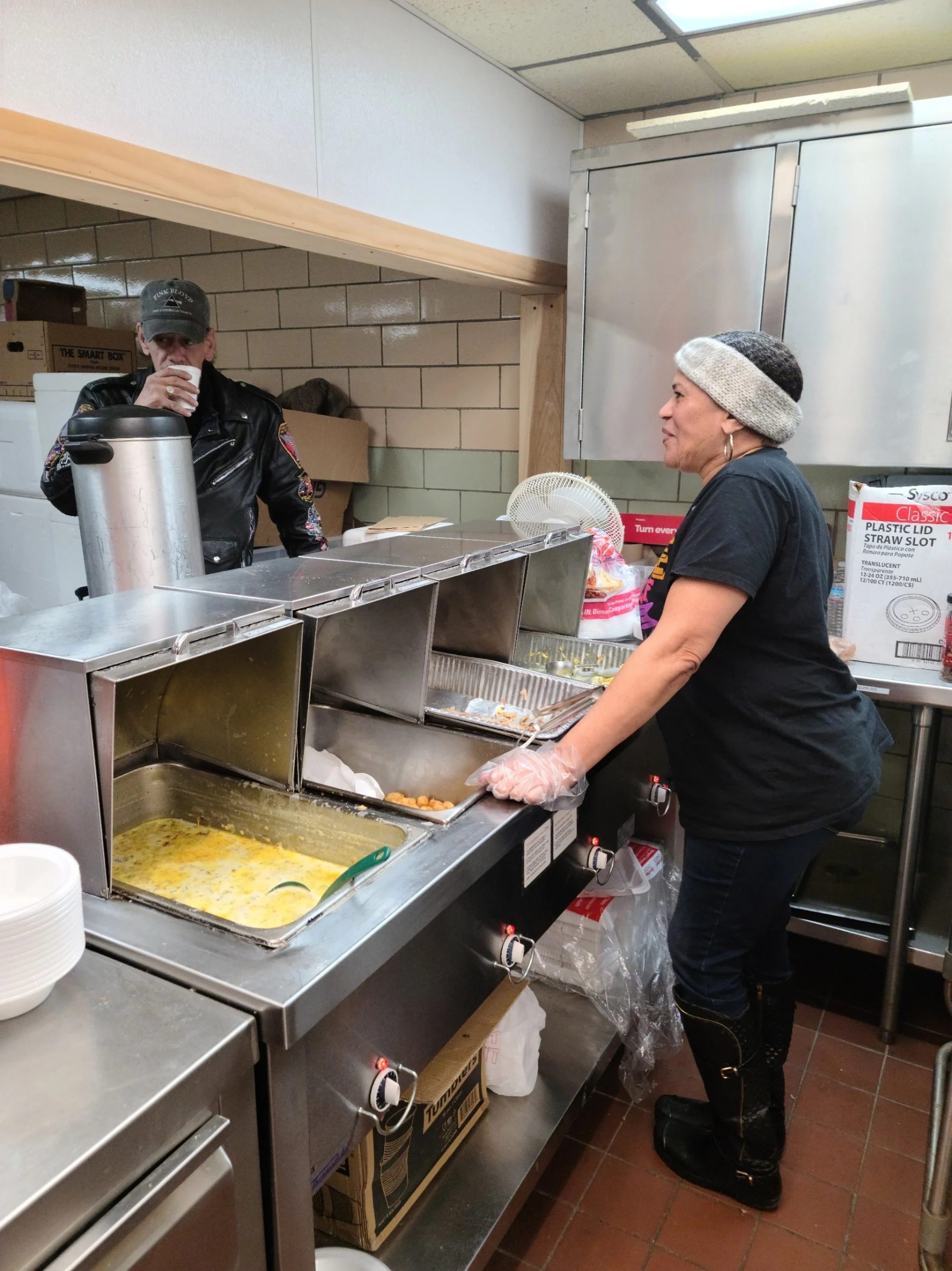 A woman stands in the kitchen, leaning over a food warming station with a bowl of soup and a ladle. She is talking to a man who is drinking from a white cup.